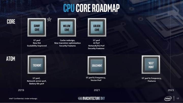 Hatırlanacağı üzere Cove isimlendirmesi Intel’in büyük zar alanına sahip çekirdekleri için kullanılıyor ve bu yıldan itibaren sahneye çıkacaklar. Sunny Cove çekirdeği Ice Lake kod isimli işlemcilere hayat verecek. Willow Cove çekirdeği 2020 yılında, Golden Cove ise 2021 yılında gelecek. Taşınabilir tarafta bu çekirdeklerin 10nm sürecine uyarlanan versiyonları olacak.