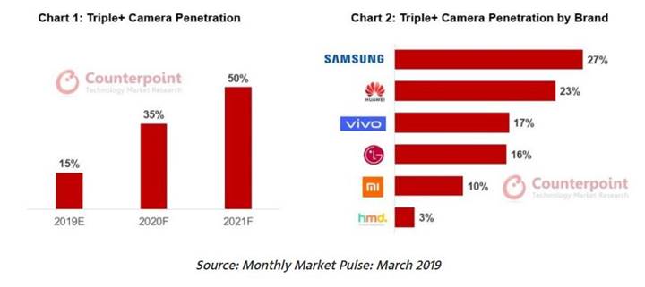 Counterpoint Research tarafından yayınlanan yeni rapora nazaran üç yahut daha fazla art kameraya sahip akıllı telefon sayısı, 2021 yılının sonuna kadar %50‘yi geçecek. Bilhassa bu yıl yükseliş gösteren üçlü kamera sistemi trendinin devam etmesi bekleniyor.