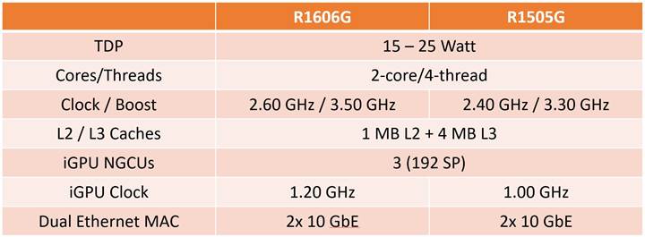 Bazı kaynaklar tahlilin Ryzen 2 tabanlı olduğunu belirtse de 14nm üretim sürecine vurgu yapılması birinci kuşağın temel alındığını gösteriyor. Zaten V1000 tahlilinden daha düzgün olmadığı tabir edilmişti. Seride iki model var ve yalnızca saat frekansları biraz farklı. 15W-25W ortasında değişen termal tasarım gücü fansız sistemlerde 12W düzeyine de inebiliyor.