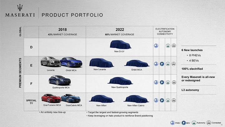 Maserati, GranTurismo modelinin yerini alacak Alfieri isimli bir spor araba çıkaracak. Buna ek olarak Levante‘den daha küçük bir SUV sunarak mevcut eser yelpazesini yeniden tasarlayacak yahut güncelleyecek.