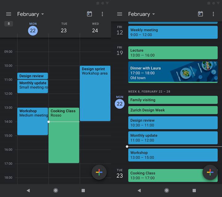 Google Takvim uygulaması mevcut tüm fonksiyonelliğini koruyor ve bu nedenle güncellemedeki konuşmaya paha tek değişiklik karanlık mod diyebiliriz. Bilhassa OLED ekranlı aygıtlarda pil verimliliğine de katkıda bulunan bu bilhassa, göz sıhhatimiz için de ehemmiyet taşıyor. Bu temayla bilrikte uygulamanın görsel olarak da hayli hoş göründüğünü de söylemek mümkün.