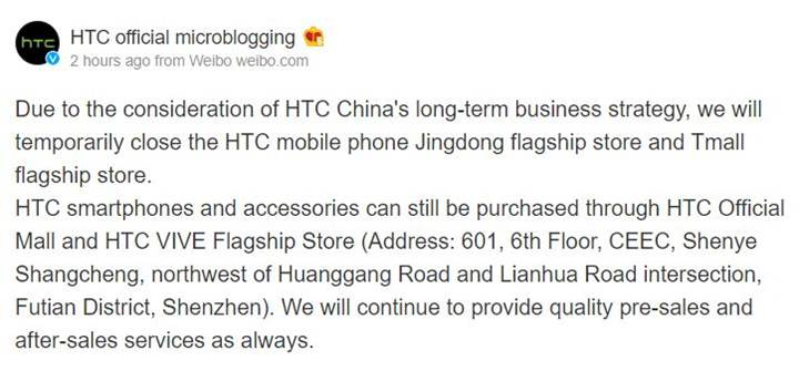 Çin’in toplumsal medya ağı Weibo’da HTC tarafından yayınlanan gönderide, firmanın süreksiz olarak mağazalarda akıllı telefon satmayı durduracağı belirtiliyor. Çinli HTC severler hâlâ firmanın kendi sitesinden sipariş verebilecek lakin şimdiki duruma nazaran birçok model stoklarda yok biçiminde gösteriliyor. Stoklarda olmayan modeller ortasında amiral gemilerinden HTC U11 ve U11+ da yer alıyor.