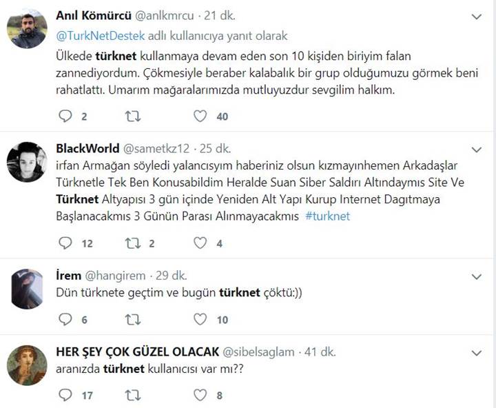 TurkNet İrtibat Hizmetleri A.Ş. üzerinden internete bağlananlar, 21 Mayıs’ın birinci dakikalarında makus bir sürprizle karşılaştı. Aldıkları hizmet büsbütün kesilmişti ve firmanın internet sitesine de ulaşılamıyordu. Bahisle ilgili TurkNet Takviye hesabı üzerinden aşağıdaki açıklama yapıldı.