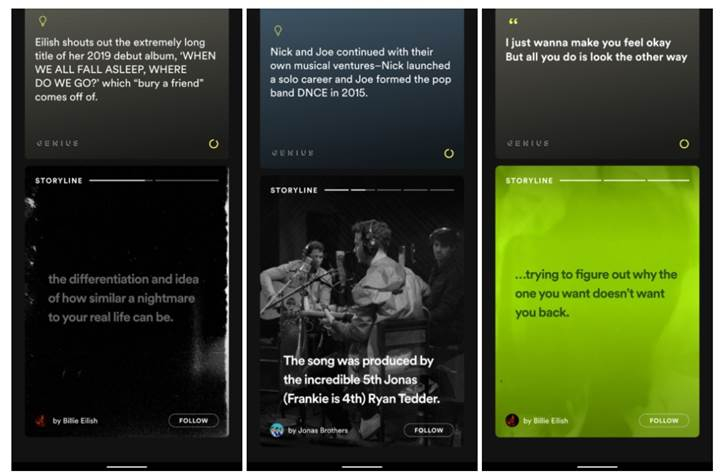 Spotify Öyküler mobil uygulamada müzik dinlerken alt kısımda bilgi kartı halinde ortaya çıkıyor. Kullanıcı karta tıkladığında üst geliyor ve sanatkarın paylaştığı bilgileri yansıtıyor. Bu bilgiler metin, şarkı sözleri ve görseller olabiliyor.